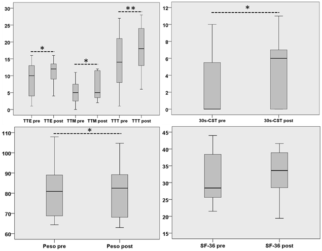La Tabla 1 muestra las características sociodemográficas y clínicas de los 11 pacientes (82,2 ± 6,9 años, 8 hombres y 3 mujeres) que completaron el estudio. Como muestra la Figura 1, el programa de entrenamiento EFAM-UV© produjo mejoras significativas (p ˂ 0,05) en fuerza de tren inferior, equilibrio estático y dinámico, marcha y peso. Los cambios no fueron significativos en IMC (30,06 ± 3,76 vs 29,80 ± 4,73), porcentaje de grasa corporal (37,29 ± 9,72 vs 36,22 ± 8,68), masa muscular (47,83 ± 11,24 vs 48,12 ± 8,35 kg.), y masa ósea (2,54 ± 0,55 vs 2,58 ± 0,41).