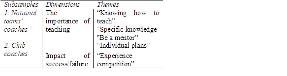 A punctual and multidimensional (Anguera, Blanco-Villaseñor, Hernández-Mendo, & Losada, 2011) deductive-inductive analysis performed in order to meet the objectives of this study. From this procedure emerged two subsamples: a) the national teams’ coaches (N.T.C.), and b) the club coaches (C.C). Both subsamples were influence by different dimensions and subsequent themes, according to previous guidelines (Gould et al., 2002), literature analysis and as described in Table 1.