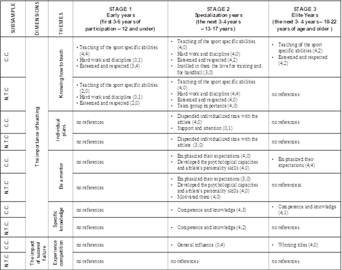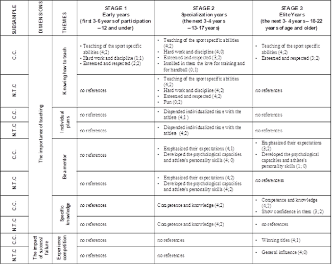 As can be seen in Table 2, all athletes reported that their club coaches emphasized the teaching of the sport specific abilities; this is the most highlighted characteristic by the interviewees at this stage. Two athletes of the most successful group also highlighted this characteristic about one national team coach. One athlete says: "(...) they began to do individual work with me. While the team was training all together, they put me apart, and I always thought I was grounded, (...) but now realize that they wanted the best for me.