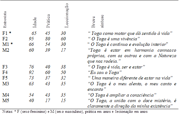 Assim, participaram 10 professores, cinco de cada sexo, com idades entre os 40 e 95 anos, dois dos professores com idade superior a 90 anos, um destes leciona, ainda, diariamente. O número de anos de prática situa-se entre 16 e 70 anos (Manos=43,3, DP=16,47) e de lecionação entre 14 e 60 anos (Manos=34,7, DP=13,48). Relativamente à sua formação os professores indicaram que realizaram formação inicial especializada em Yoga em Centros Internacionais e continuaram com a sua formação de forma regular e contínua para o seu aperfeiçoamento. Todos foram ou continuam a ser formadores de professores de Yoga. Para cada participante, apresenta-se um quadro com a sua apresentação, com indicação do sexo, da idade, dos anos de prática e de lecionação e, transcreve-se uma frase que caracteriza, de forma sucinta, a sua relação com o Yoga (Tabela 1).