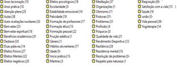 A prática de Yoga é vista como oferecendo mais confiança à pessoa, mais entusiasmo e essas características passam para a vida. O que é exemplificado por“e depois dá mais confiança à pessoa, mais força de vontade, mais entusiasmo. Passa da aula de Yoga para o exterior.” (M2), e ainda: “a mente não vá atrás das atitudes, das influências que possam haver no dia a dia.” (M1). Outro entrevistado acrescenta: “uma preparação melhor que o Yoga nos dá, o sofrimento também não quer dizer que não exista mas é visto de uma maneira diferente.” (F5)