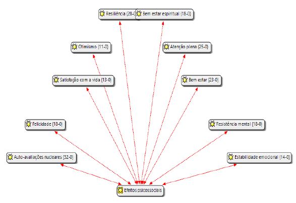 Os códigos de família agrupam códigos como se verifica na Figura 1, em que a família dos efeitos psicossociais, tem associados seguintes os códigos, com indicação do número de vezes em que são citados na totalidade das entrevistas: autoavaliações nucleares, felicidade, satisfação com a vida, otimismo, resiliência, atenção plena, bem-estar, resistência mental e estabilidade emocional. (por exemplo o código Bem-estar surge na totalidade das entrevistas referenciado 23 vezes).