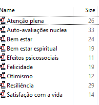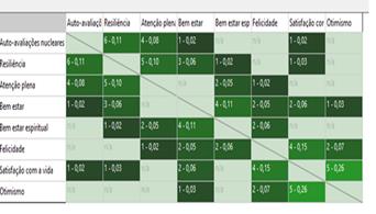 Verifica-se a existência de co-ocorrências entre vários pares de categorias: (i) entre autoavaliações nucleares e a resiliência, a atenção plena, o bem-estar, a felicidade, a satisfação com a vida e o otimismo, (ii) entre a resiliência, a atenção plena, o bem-estar, o bem-estar espiritual e a satisfação com a vida, (iii) entre a atenção plena, o bem-estar espiritual e a felicidade, (iv) entre o bem-estar,o bem-estar espiritual, a satisfação com a vida e o otimismo, (v) entre o bem-estar espiritual e a felicidade, (vi) entre a felicidade, a satisfação com a vida e o otimismo, (vii) entre a satisfação com a vida e o otimismo.