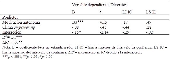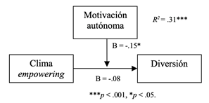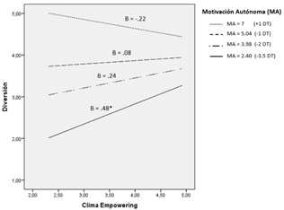 En la Figura 1 se ofrece la representación gráfica del modelo de regresión moderada que muestra la interacción del clima empowering y la motivación autónoma como predictores de la diversión.