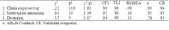 Como se ha comentado anteriormente, el primer paso fue analizar la validez factorial y fiabilidad de las escalas de medida. En la Tabla 1 se observan los índices de bondad de ajuste de los modelos unifactoriales puestos a prueba para cada una de las escalas. Respecto a clima empowering, el modelo unifactorial mostró índices de bondad de ajuste adecuados ((2/gl = 1.83, CFI = .90, TLI = .90, RMSEA = .09). Los índices de ajuste de los modelos unifactoriales para la escala de motivación autónoma ((2/gl = 3.39, CFI = .91, TLI = .90, RMSEA = .16) y para la escala de diversión ((2/gl = 3.07, CFI = .94, TLI = .90, RMSEA = .15) fueron satisfactorios, excepto por el RMSEA que presentó valores por encima de .10 en ambos casos.