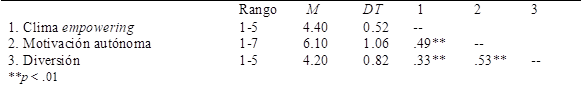 La Tabla 2 muestra el rango de respuesta, media, desviación típica (DT) y correlaciones existentes entre las variables del estudio. Los análisis indicaron una relación positiva y significativa entre el clima empowering y la diversión (tal como se planteaba en la Hipótesis 1), lo cual se confirma con el análisis de correlación (r = .33, p < .01). Además, la motivación autónoma presentó relación positiva y significativa tanto con el clima empowering, como con la diversión.
