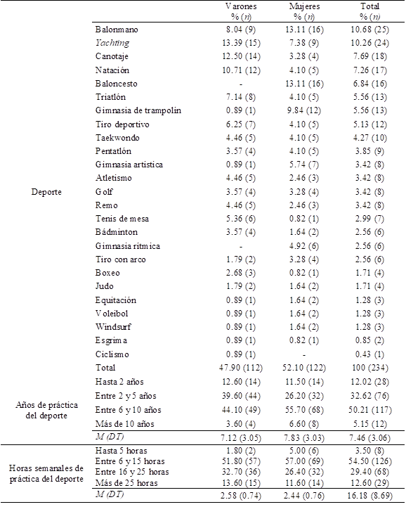 La muestra estuvo compuesta por 234 adolescentes (47.90 % varones, 52.10 % mujeres) de entre 12 y 16 años de edad (M = 14.48; DT = 1.09) seleccionados para el Equipo Olímpico Argentino, dentro del Plan Operativo de los Juegos Olímpicos de la Juventud -Buenos Aires 2018- (ENARD, 2014). La distribución de casos por deporte y género, así como años de práctica deportiva y horas semanales de práctica se presentan en la Tabla 1.