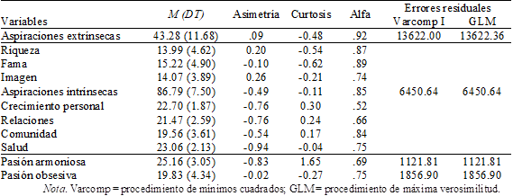 En la Tabla 2 se presentan los estadísticos descriptivos de la muestra total, los índices de consistencia interna para cada una de las variables y los valores de los errores residuales obtenidos en los análisis de componentes varianza. Salvo dos de las escalas que presentaron índices con algunas carencias (i.e., crecimiento personal y relaciones), se encontraron índices de consistencia interna aceptables. Siguiendo a Morales-Sánchez, Hernández-Mendo y Blanco-Villaseñor (2009), la evaluación de los modelos de medida es un proceso relativo más que un proceso basado en criterios absolutos, por lo tanto, los indicadores de fiabilidad para esta muestra presentan algunas carencias, pero puede sostenerse que el modelo propuesto por los autores de la prueba puede ser útil para el presente trabajo, aunque se deberá considerar esta limitación.