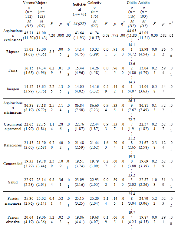 En la Tabla 3 se presentan los resultados de los análisis univariados. Los varones tuvieron puntajes significativamente más altos que las mujeres en las aspiraciones extrínsecas de riqueza y fama y las aspiraciones extrínsecas en su conjunto, así como también en pasión obsesiva. Los adolescentes de deportes cíclicos tuvieron más pasión armoniosa que los de deportes acíclicos y considerando el género, los varones de deportes acíclicos tuvieron puntajes más altos en fama (M varones = 16.85; M mujeres = 13.51) y riqueza (M varones = 15.85; M mujeres = 12.39).