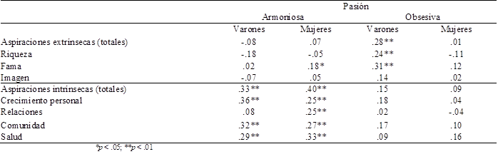 Los resultados mostraron que para ambos géneros, las aspiraciones intrínsecas se asocian significativamente con la pasión armoniosa. Con respecto a la pasión obsesiva, solo se encontraron correlaciones significativas con las aspiraciones extrínsecas de riqueza y fama, solo en el grupo de varones.