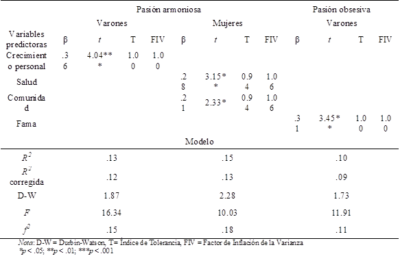 Para analizar la contribución de las aspiraciones vitales en los tipos de pasión, se realizaron análisis de regresión para varones y mujeres por separado (véase Tabla 5). Previo a realizar el análisis, se comprobaron los supuestos. Los valores del índice de Durbin-Watson fueron adecuados (Pardo y Ruiz, 2005) y los estadísticos de colinealidad indicaron valores aceptables de Inflación de la Varianza y del índice de Tolerancia (Hair, Anderson, Tatham, y Black, 2001).