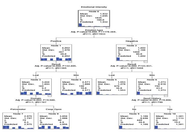 The first explanatory variable of emotional intensity was the emotion type (p <.001; F = 1178.369; df1, df2 = 1833). The positive emotions (e+) (n = 367, M = 4.0) were more intense (p <.001) than the negative ones (e-) (n = 1468, M = 1.4). The second predictive variable for both types of emotions was the result: losing recorded more intense values of e+ (p <.001) (n = 676, M = 1.5) with respect to winning (n = 792, M = 1.2). In the opposite direction, the e- were superior to winning (n = 198; M = 4.5) with respect to losing (n = 169; M = 3.4). In the e+ the third predictive variable was recorded only in the loss result and corresponded to the type of game. The highest emotional intensity (p <.002) was generated by the cooperation-opposition (n = 90, M = 3.8) versus the psychomotor games, node 7 (n = 79, M = 2.9). For the e-, the third predictive variable was obtained in the winning result and corresponded to the type of sports history (SH). The students with SH experienced more intense e- (p <.003) when winning (n = 352, M = 1.3) than the students without SH (n = 440, M = 1.1).