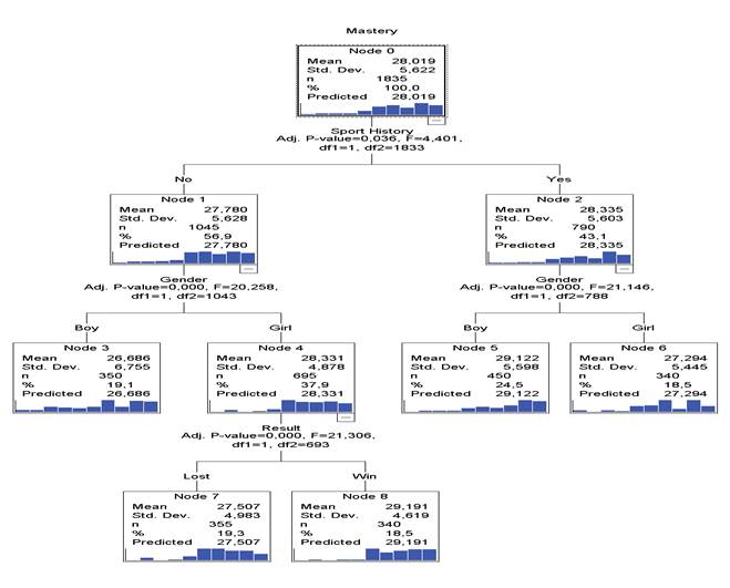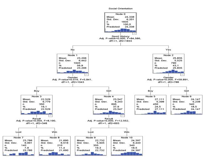 The differences between figures 2-3 are scarce. Although it should be noted that the average values of Mastery (28) exceeded Social Orientation (22.3) from their respective origin nodes. On the other hand, from the result variable obtained by the boys without sports history (p < 0.04) (Figure 3), it emerged when losing the node 7 (n = 140; 23.7) and when winning the node 8 (n = 210; 21.69) , nonexistent in the predictive tree that took Mastery as dependent variable.
