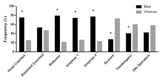 In all, 501 matches were analyzed and information from 4825 coaching staff and referee crews was collected. Figure 1 shows the frequency of male and female participation in each position, during the course of the seven seasons. Men have a significantly higher participation, compared to women as head coach, referee, umpire 1 and umpire 2. A higher participation of women could be found for scorer and timekeeper positions. Men and women were found equally, amongst assistant coaches and 24s operators.