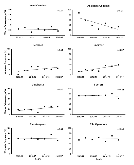Figure 2 shows the frequency of women’s participation as coaching staff and referees throughout the seven seasons. No increase in women’s participation was found for head coach, scorer, timekeeper and 24s operator, over the years. On the other hand, women’s participation as assistant coach was found to decrease from 88% (2010) to 34% (2017). Only the positions of referee, umpire 1 and umpire 2 showed an increase in women’s participation in the past seven years.