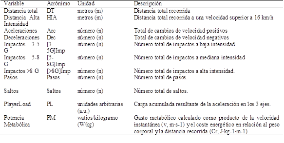 Se determinaron como variables independientes la diferencia de marcador en cada uno de los cuartos disputados, clasificándose en partido disputado (diferencia menor de 10 puntos) y partido desequilibrado (diferencia mayor de 10 puntos) (Lorenzo et al., 2010). Así mismo, las variables dependientes registradas cuantificaban la carga externa realizada por el jugador, analizando las siguientes que se describen en la tabla 1: distancia total (Dellaserra, Gao, y Ransdell, 2014), distancia a alta intensidad (Stojanović et al., 2018), aceleraciones y deceleraciones (Svilar, Castellano, Jukic, et al., 2018), impactos a diferentes rangos (3-5, 5-8, >8G) (Cunniffe, Proctor, Baker, y Davies, 2009), pasos y saltos (Reina, García-Rubio, Feu, y Ibáñez, 2018), PlayerLoad y potencia metabólica (Reche-Soto et al., 2018).