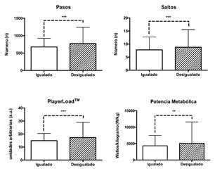 En la figura 1 y 2 se muestra el análisis descriptivo e inferencial de las variables cinemáticas analizadas en la presente investigación en función del resultado parcial de los cuartos. En cada uno de los cuartos, los jugadores de baloncesto sub-18 de nivel élite cubren una distancia total de 864.39±181.58 metros, de los cuales un 3.71±1.12% se producen a alta intensidad (>16 km/h), realizan 724±144 pasos, 8±3 saltos, un poder metabólico de 4711.74±1947.68 W/kg y reciben un PlayerLoadTM de 16.08±3.48 a.u. Además, realizan un total de 198±53 aceleraciones y 193±51 deceleraciones, reciben un total de impactos de 107±26 entre 3-5 G, 18±6 entre 5-8 G y 3±1 por encima de 8 G. Finalmente, en relación al análisis inferencial, se encuentran diferencias estadísticamente significativas en todas las variables de carga externa analizadas, siendo las exigencias cinemáticas mayores en los partidos desequilibrados respecto a los partidos equilibrados (p> .01; t= 1.93-3.32).