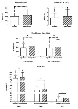 Para calcular la magnitud de las diferencias entre entrenamientos y partidos se calculó el tamaño del efecto mediante la d de Cohen, siendo acompañado por la probabilidad de efecto mediante las inferencias basadas en la magnitud (MBI). El estadístico d fue clasificado como efecto bajo (0-0.2), efecto pequeño (0.2-0.6), efecto moderado (0.6-1.2), efecto grande (1.2-2.0) y efecto muy grande (>2.0) (Hopkins, Marshall, Batterham, y Hanin, 2009). Para el análisis estadístico se utilizó el software Statistical Package of Social Science (versión 24, 2016; IBM Corp., IBM SPSS Statistics para MAC OS, Armonk, NY, EEUU) y para el diseño de los gráficos se utilizó el software GraphPad Prism (versión 7; GraphPad Software, La Jolla CA, EEUU).