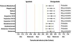 En la figura 3, se muestra la magnitud de las diferencias en las variables analizadas en relación al resultado final de los cuartos mediante el estadístico d de Cohen, encontrando un moderado tamaño del efecto (d= .42 - .64). Los mayores tamaños del efecto se encuentran en la variable Impactos en todos los rangos de intensidad (3-5G, 5-8G, >8G), mientras que la menor magnitud de las diferencias se encontró en la variable Potencia Metabólica.