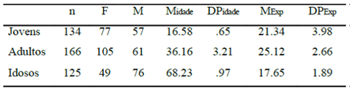 No total, participaram neste estudo 425 indivíduos (sexo feminino = 231) praticantes de atividade física em contexto de ginásio e/ou health clubs em Portugal. Os praticantes tinham uma experiência de prática de atividade física regular entre 6 a 40 meses (M = 21,34 ± SD = 4,12) e uma prática semanal entre 2 a 5 vezes por semana (M = 2,43 ± SD = 0,98). A atividade física praticada era primordialmente focada na componente de trabalho de força e capacidade cardiorrespiratória na sala de exercício (89%), no entanto os participantes também realizavam regularmente aulas de grupo (11%). Os participantes foram classificados como jovens (≤18 anos), adultos (>18 e <65 anos) e idosos (≥65 anos) de acordo com a Organização Mundial de Saúde. Na Tabela 1 estão as características de cada grupo relativamente à média de idade, número de participantes e experiência da prática de atividade física.