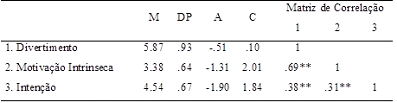 De acordo com a Tabela 2, a perceção de divertimento foi a variável que apresentou a média mais alta comparativamente à motivação intrínseca e a intenção de continuar na prática de atividade física. Todas as variáveis apresentaram uma distribuição normal, dados os valores de assimetria e curtose estarem contidos dentro dos parâmetros aceitáveis. De acordo com os coeficientes de fiabilidade compósita, todas os grupos apresentaram valores acima do recomendado (jovens = 0.95; adultos = 0.95; idosos = 0.94).