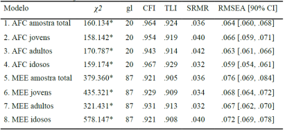 A análise de invariância do modelo de medida demonstra a capacidade de aplicabilidade do mesmo questionário em grupos com características diferentes (Sass, 2011). De facto, são vários os autores que descrevem a análise de invariância como uma análise fundamental na validação de escalas de medida (Chen, 2008; Cheung & Rensvold, 2002). Nesse sentido, realizamos uma análise multi-grupos entre grupos etários (i.e., jovens, adultos e idosos) de acordo com recomendações de diversos autores (Byrne, 2011; Cheung & Rensvold, 2002). Primeiramente, o modelo de medida deve ajustar-se em cada grupo (i.e., jovens, adultos e idosos). Seguidamente, foi testado a invariância configural (sem restrições de igualdade), invariância métrica (restrições nos pesos fatoriais dos itens), invariância escalar (restrições nos pesos fatoriais dos itens e nas interceções dos itens) e invariância residual (restrições nos pesos fatoriais dos itens, nas interceções e variância dos itens). As diferenças no CFI (∆CFI) e TLI (∆TLI) entre o modelo configural com o modelo métrico, escalar e residual deve ser inferior a 0.10 (Cheung & Rensvold, 2002) e as diferenças no RMSEA (∆RMSEA) devem ser inferiores a 0.15 (Chen, 2007).