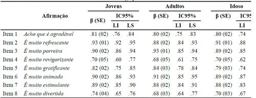 De acordo com os resultados da análise multi-grupos descritos na Tabela 5, é possível de afirmar que o modelo de medida da perceção do divertimento é invariante entre faixas etárias. De facto, a perceção parece ser equivalente entre grupos dados as diferenças no CFI e TLI serem inferiores a 0.10.