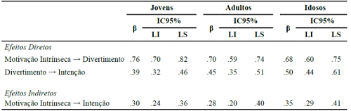 Interessantemente, o valor preditivo da motivação intrínseca para o divertimento variou entre grupos, mostrando que grupos de pessoas com idades diferentes podem percecionar de forma diferente a sensação de prazer e divertimento adjacente à prática de exercício físico (Mullen et al., 2011). De acordo com os resultados obtidos, a motivação intrínseca tem um efeito maior para o divertimento nos jovens. Isto poderá estar relacionado com a vertente lúdica envolvida na atividade. Os jovens parecem estar envolvidos na prática de exercício físico por considerarem o comportamento algo prazeroso e que lhe promove uma sensação de divertimento. De facto, estudos anteriores têm demonstrado que jovens de ambos os sexos apresentam valores elevados de divertimento, seja em contexto de educação física (Dishman et al., 2005), bem como no contexto desportivo (Monteiro et al., 2017). Não obstante, o divertimento apresentou um efeito direto para a intenção maior nos idosos, comparativamente aos jovens e aos adultos. Igualmente, a motivação intrínseca apresentou um efeito indireto maior nos idosos comparativamente aos outros dois grupos praticantes de exercício físico. Estes resultados parecem corroborar com estudos prévios (Dacey, Baltzell, & Zaichkowsky, 2008) evidenciando que os idosos que regulem o seu comportamento para a prática de exercício físico de forma intrínseca, considerando o comportamento como parte integrante deles, estão mais suscetíveis a sentirem prazer e divertimento durante a prática de exercício físico. Consequentemente, quando um sujeito realiza um comportamento do qual gosta e sente benefícios psicológicos adjacentes, apresenta maior intenção de voltar a realizar e manter esse comportamento como parte integrante no quotidiano (Mullen et al. (2011)).