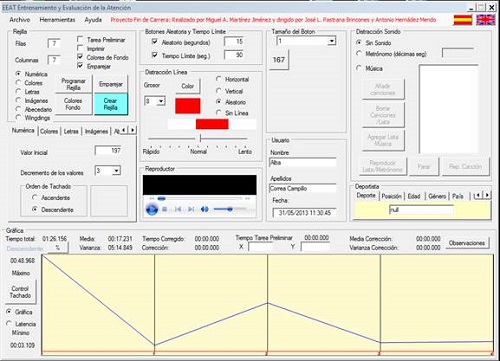 a) Test de Rejilla 1.0 (Hernández-Mendo et al., 2012). Este programa se trata de una aplicación para Windows desarrollada bajo la plataforma .NET en lenguaje de programación C# y con el entorno de programación Visual Studio. Con este software se pueden realizar diferentes ejercicios basados fundamentalmente en la localización de estímulos en una rejilla regulable en tamaño. Estos estímulos pueden ser números, colores, letras, imágenes, abecedario y windings. Se puede programar el tamaño de los ítems, el color de fondo, que cambien de lugar, el tiempo de presentación o la aparición de líneas distractoras. Permite conocer el tiempo entre cada estímulo y los tiempos de latencia. Calcula indicadores de eficacia y de efectividad, así como porcentajes de aciertos/errores- relativos/absolutos. Aunque según la configuración del ejercicio se pueden entrenar y evaluar diferentes tipos de atención, fundamentalmente este programa se centra en la Atención Selectiva o Focal/Atención Serial (Estévez-González, García-Sánchez, y Junqué, , 1997).