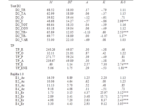 En la Tabla 1 se muestran los estadísticos descriptivos y de normalidad de las variables objeto de estudio. Como se puede observar, algunas de las medidas analizadas mostraron problemas de normalidad.