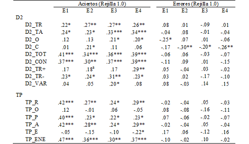 Sí se considera consistente el patrón encontrado en las relaciones entre los diferentes tests. Aunque algunas correlaciones son bajas y otras moderadas, el estudio de las relaciones entre el D2 y el TP han mostrado puntuaciones similares, siendo bajas o moderadas las relaciones entre ellas y siendo más visibles las asociaciones entre puntuaciones principales, así como elementos procesados o aciertos, que con otras puntaciones como errores o comisiones. Por ello, se puede considerar que existe coherencia en los valores encontrados y, aunque se esperaba encontrar vínculos más fuertes entre las puntuaciones, se podría considerar aceptable los resultados encontrados y sugerir que los ejercicios de Rejilla 1.0 estarían evaluando atención selectiva, al menos que fuera una de las capacidades cognitivas principales implicada en la tarea.