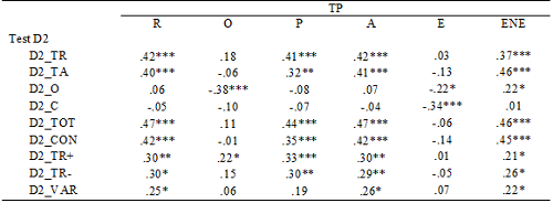 Asimismo, las relaciones entre las principales puntuaciones del test D2 (TOT y CON) mostraron correlaciones moderadas con los eneatipos del Toulouse-Piéron (r = .42 a .47) (tabla 3).