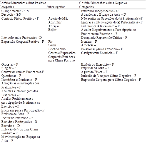 A observação sistemática é reconhecida por vários autores como sendo um efetivo instrumento de pesquisa na descrição quantitativa dos comportamentos do treinador de desporto e/ou do professor de Educação Física (Anguera, Blanco, Losada & Hernández-Mendo, 2000; Mars, 1989; Sarmento, Veiga, Rosado, Rodrigues & Ferreira, 1998). O comportamento pedagógico dos instrutores de fitness, nas aulas de grupo, tem vindo a ser uma preocupação por parte de vários investigadores, tal como mencionado numa revisão sistemática desenvolvida por Rodrigues et al. (2018). Neste sentido, alguns instrumentos têm vindo a ser desenvolvidos no contexto do fitness nomeadamente: o Sistema de Observação do Comportamento dos Instrutores de fitness - SOCIF (Franco, Rodrigues & Balcells, 2008) que permite analisar de forma geral o comportamento pedagógico dos instrutores de fitness em aulas de grupo; o Sistema de Observação de Feedback de Instrutores de fitness em Aulas de Grupo - SOFIF-AG (Franco & Simões, 2017), que permite analisar o comportamento de feedback realizado pelos instrutores de fitness em aulas de grupo; o Sistema de Observação da Comunicação Proxémica do Instrutor de fitness, em Aulas de Grupo - SOPROX- fitness (Alves et al., 2013), que permite analisar a comunicação proxémica dos instrutores de aulas de grupo e o Sistema de Observação da Comunicação Cinésia - SOCIN- fitness (Alves et al., 2014) que permite analisar a comunicação cinésia dos instrutores de fitness em aulas de grupo. Relativamente ao comportamento do instrutor de fitness foi recentemente validado para português o questionário relativo à satisfação e frustração das necessidades dos instrutores de fitness (Rodrigues et al., 2019). No que diz respeito ao comportamento acerca do clima de aula foi encontrado um instrumento de observação denominado Sistema de Observação do Clima de Aula de Sarmento, Veiga, Rosado, Rodrigues e Ferreira (1998), cujo objetivo é avaliar variáveis/comportamentos do professor associados à criação de um clima de aula positivo, e que já foram utilizados em alguns estudos no contexto do fitness, embora com adaptações (Franco, Simões, Alves, Vidal & Silva, 2010). O referido instrumento é constituído por 17 categorias de análise representativas de alguns dos comportamentos mais provavelmente responsáveis pela criação de um clima de aula positivo.