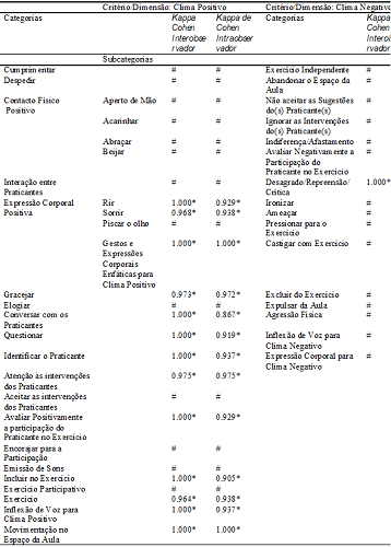 Após concluída a versão final do SOCA-AGF, Brewer e Jones (2002), Gilbert et al. (1999) e Prudente et al. (2004), sugerem a realização da fiabilidade interobservadores, testando desta forma a consistência das observações do novo sistema de observação. Depois de realizada a identificação das categorias do sistema, discutido o protocolo de observação e avaliada a aprendizagem das categorias, pelos dois observadores, foi visionado um vídeo de uma aula de grupo e realizada a respetiva codificação por ambos os observadores, separadamente, não havendo acesso oral ou visual entre eles. Realizada a codificação foi testada a fiabilidade interobservadores a fim de verificar a existência de concordância entre observadores, através da medida de concordância Kappa de Cohen indicada por Pestana e Gageiro (2005). Foram aceites valores de fiabilidade iguais ou superiores a 80%.