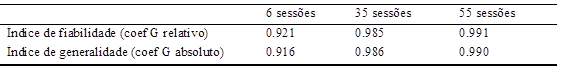 No que diz respeito ao processo de desenvolvimento e validação do sistema de observação SOCA-AGF verificou-se que, na fase 4, relativa à fiabilidade inter-observadores (tabela 2), os valores de Kappa de Cohen obtidos foram sempre superiores a 80%, variando entre 96.4% e 100%. Assim sendo, estes resultados indicam que as definições das categorias do SOCA-AGF aparentam ser claras, objetivas e por isso com fiabilidade. Na fase 5, relativa à fiabilidade intraobservadores (tabela 2), os valores de Kappa de Cohen variaram entre 86.7% e 100%. Estes resultados indicam a existência de estabilidade temporal nas observações, refletindo entendimento e compreensão das dimensões e categorias que compõem este novo sistema de observação (SOCA-AGF). Para a análise da generalização foram seguidas as recomendações de Blanco-Villaseñor, Castellano, Hernández-Mendo, Sánchez-López e Usabiaga (2014). Na determinação do número de sessões necessárias para generalizar com precisão realizou-se um desenho baseado em 2 facetas (Categorias e Sessões Observadas = C/S). A estimação dos componentes de variância foi realizada de forma aleatória infinita. A análise mostra uma grande variedade associada à faceta Categorias (64.6%), seguidas da faceta de interação entre Categorias e Sessões Observadas (33.4%) e o restante para a faceta Sessões Observadas (2%). Considerando os índices de generalização para esta estrutura verifica-se (tabela 3) que as 6 sessões observadas no presente estudo permitem um coeficiente de generalização de 0.921 (valor relativo) e 0.916 (valor absoluto). Apesar destes valores serem aceitáveis para um índice de generalização quase perfeito (perto da unidade) seriam necessárias observar 55 sessões, tal como exposto na tabela 3. Os resultados obtidos através do SOCA-AGF referem-se à codificação de um total de 2375 comportamentos de clima de aula de 6 instrutoras em 2 atividades. A duração das aulas de hidroginástica variou entre 37’40’’ e 54’15’’ enquanto que a localizada variou entre 41’14’’ e 43’37’’. Observou-se que o número de comportamentos de frequência por parte das instrutoras foi sempre superior no critério/dimensão clima positivo (CP) do que no critério/dimensão clima negativo (CN) quer seja na atividade de hidroginástica (CP - 695.308 e 478 ocorrências; CN - 0 e 0 ocorrências), quer seja na atividade de localizada (CP - 383, 356 e 154 ocorrências; CN - 1 e 0 ocorrências). Em relação aos comportamentos com registo de duração o mesmo se verificou, ou seja, os comportamentos pertencentes a CP tiveram uma duração sempre superior aos comportamentos de CN quer na hidroginástica (CP - 00:23:19, 00:23:08 e 00:15:02; CN - 00:00:00, 00:00:00 e 00:00:00), quer na localizada (CP - 00:21:47, 00:16:03 e 00:18:42; CN - 00:00:47, 00:00:00 e 00:00:00). No que diz respeito à frequência de comportamentos por minuto podemos observar que, relativamente a CP, na hidroginástica as instrutoras realizaram maior número de comportamentos por minuto (M±DP=11.0±2.4), do que na localizada (M±DP= 7.0±3.0). No caso do CN na hidroginástica não existiram casos de registo de frequência (M±DP=0.0±0.0), enquanto na localizada existiram comportamentos de registo por parte de uma das instrutoras (M±DP=0.0±0.1). Relativamente aos resultados apresentados pelas categorias Cumprimentar e Despedir, que são registadas de acordo com “realiza”/”não realiza” (S/N) verificou-se que todas as instrutoras de hidroginástica se despediram dos participantes na aula mas apenas uma os cumprimentou no início da aula. Relativamente à atividade de localizada duas das instrutoras cumprimentaram e despediram-se dos praticantes e uma não realizou nenhum destes comportamentos.