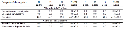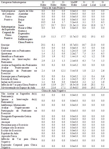 Posteriormente serão apresentados (tabela 4) os resultados referentes à frequência dos dados das categorias cujo método de registo é a frequência dos comportamentos de clima de aula (%) de cada instrutora (I), bem como a média e desvio padrão dos referidos comportamentos (%) em cada uma das atividades (hidroginástica e localizada), nas várias categorias e subcategorias das respetivas dimensões do clima de aula. Verificou-se que na dimensão CP os comportamentos mais realizados na hidroginástica foram: sorrir (subcategoria da expressão corporal para CP) (M±DP= 21.2±1.3%); inflexão de voz para CP (o instrutor muda a entoação de voz, dando ênfase ao discurso) (M±DP= 16.5±3.6%) e movimentação no espaço da aula (o instrutor move-se no espaço da aula, mantendo contacto visual com a classe) (M±DP= 15.9±8.5%).