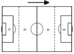 El campo de fútbol se dividió transversalmente en cuatro zonas, que se designaron como Z1, Z2, Z3 y Z4. Esta forma de división está basada en la propuesta original de Castelo (1999) asociando a cada zona unos objetivos tácticos propios. Las zonas se diferenciaron por las propias líneas marcadas en el terreno de juego, tal y como queda reflejado en la Figura 1.