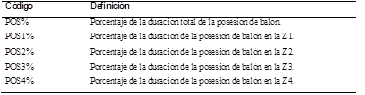 En la Tabla 1 se recogen los códigos y las definiciones de los indicadores de rendimiento de posesión. Todos estos indicadores están relativizados al porcentaje de la duración total del tiempo de juego efectivo del partido medido en minutos.