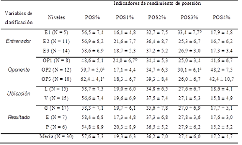 En la Tabla 2 se muestran la media y la desviación estándar de los indicadores de rendimiento de posesión, diferenciándose cada una de las variables de clasificación estudiadas: entrenador, nivel del oponente, ubicación del partido y resultado final.