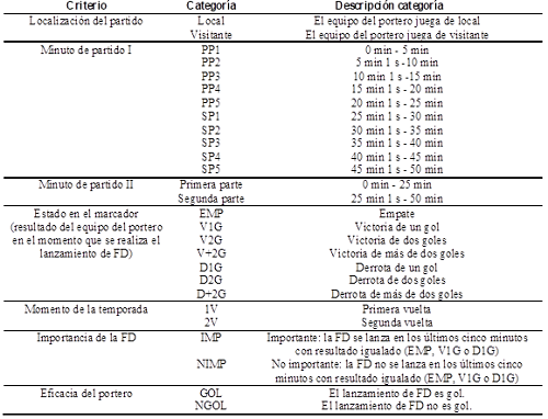De la relación entre el tiempo de partido y el estado del marcador surge el concepto de momento crítico, definido como el momento clave que contribuye decisivamente en las victorias o en las derrotas (Navarro, Gómez, Lorenzo, Lorenzo y Jiménez, 2015). En esta línea, McEwan, Gini, y Bray (2012) analizaron los shootout en hockey hielo y observaron que los porteros que actúan como locales tienen un porcentaje de eficacia (%EP) más alto que los porteros visitantes cuando tienen que defender un penalti para no perder el partido. Por el contrario, el %EP de los locales es inferior respecto a los visitantes cuando el penalti a detener es para ganar el partido. Jiménez-Torres y López-Gutiérrez (2012) detectaron que, en las prórrogas de baloncesto, y en comparación con las segundas partes de partido, los jugadores locales bajan su acierto en los tiros libres y los jugadores visitantes lo aumentan. Roffé, De la Vega, Garcia-Mas y Llinás (2007) determinaron que los “goles psicológicos” en fútbol, anotados en el último tramo de la primera parte, influyen positivamente en el resultado final del equipo que marca este gol. Teniendo en cuenta las características anteriores, la enorme importancia y responsabilidad que el HP otorga al portero en el rendimiento final de los equipos, la existencia de diversas variables influyentes en el HP y la falta de investigaciones en el estudio de la FD y del rendimiento de los porteros en el HP, se plantea la necesidad de estudiar dicha circunstancia. Así pues, el objetivo del presente estudio fue analizar la influencia de las siguientes variables contextuales de partido: a) localización, b) minuto de partido, c) estado del marcador, d) momento de la temporada, e) importancia de la falta directa; sobre la eficacia del portero en las FD.