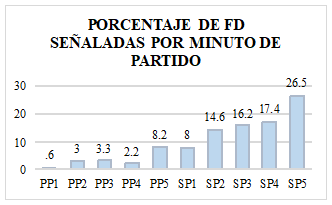 El aumento de la cantidad de FD lanzadas a medida que avanza el partido, siendo el SP5 el período en el que se concentran la mayor cantidad de FD, se justifica por la normativa que regula las FD y por la estrategia de los equipos. Cuando un equipo comete 10 faltas de equipo es castigado con una FD en contra, seguidamente a esta primera acumulación de 10 faltas, cada cinco faltas de equipo este es sancionado con una nueva FD. Por consecuencia, a medida que avanza el partido los equipos acumulan faltas de equipo y estas son sancionadas con FD. Estratégicamente, muchos equipos esperan a los instantes finales de los partidos para realizar un juego más intenso, ya sea para presionar al equipo rival para recuperar la desventaja en el marcador o para mantener un resultado favorable. Este aumento de la intensidad genera situaciones que facilitan cometer faltas de equipo o recibir tarjetas azules, siendo esta última amonestación sancionada directamente con una FD. En comparación con otras investigaciones de otros deportes de cooperación y oposición que han analizado la influencia del tiempo de partido, se observa el aumento de faltas en los minutos finales de partido (Castellano y Zubillaga, 1995a, 1995b, 1995c; Jiménez-Torres y López-Gutiérrez, 2012; Maneiro, 2014; Kozar et al., 1994) coincidiendo con los datos que se muestran sobre las FD.
