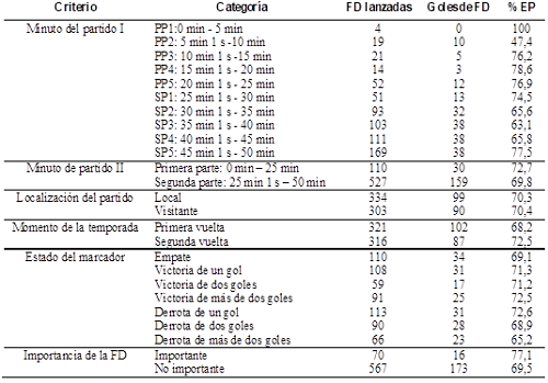 Del total de las FD analizadas, a medida que avanza el partido, sobre todo en la segunda parte, aumentaron las FD señaladas (figura 1), evolucionando de las cuatro FD (0,6%) señaladas en los primeros cinco minutos de partido (PP1) hasta las 169 FD (26,5%) en los últimos cinco minutos (SP5). En las segundas partes se lanzaron el 82,74% de las FD y se marcaron el 84,12% de los goles de FD (tabla 3).