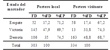 Los resultados de la influencia del momento de la temporada sobre las FD permiten observar que en la primera vuelta se lanzaron 321 FD (50,39%) y en la segunda vuelta 316 FD (49,61%). En la primera parte del campeonato se marcaron el 53,97% de goles de FD mientras que en la segunda parte el 46,03%. Cuando el estado del marcador presenta resultados igualados (empate y victoria o derrota de un gol) se lanzaron el 51,96% de las FD. El 40,5% de FD que recibió el portero fueron con el resultado favorable, mientras que el 42,23% de FD las recibió estando con un resultado desfavorable. Los resultados del estado del marcador, presentados en la tabla 4, diferencian si el portero actúa como local o visitante y permiten destacar que los locales afrontaron más FD en situación de resultado favorable (47,9% que los porteros visitantes (33,8%).