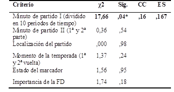 En la tabla 5 se presentan los resultados de las correlaciones entre la eficacia del portero en la FD y las diferentes variables contextuales. La variable minuto de partido, analizada teniendo en cuenta el tiempo de partido dividido por 10 periodos de cinco minutos, es la única variable contextual que tuvo una relación significativa con la eficacia del portero en la FD (p = ,04; w = ,167). El coeficiente de contingencia de 0,16 refleja una asociación débil entre la variable minuto de partido y la efectividad.