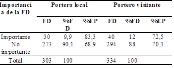 Los resultados de la eficacia del portero en relación con la importancia de la FD evidenciaron que en los momentos de máxima importancia el %EP fue del 77,1%. Por su parte, en los momentos que no son considerados de importancia, la eficacia fue del 69,5%. Entre porteros locales y visitantes, y en correspondencia con estos momentos críticos, el %EP más alto que se consiguió alcanzó el 83,3% por parte de los porteros locales (tabla 6).