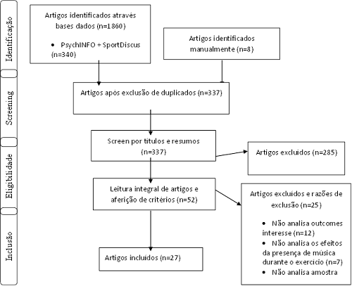 A pesquisa efetuada resultou na identificação de 337 artigos, após exclusão de 11 duplicados. Após leitura dos títulos e resumos, 52 artigos foram considerados potencialmente relevantes. Após leitura integral destes 52 artigos, 25 foram excluídos por não cumprirem um ou mais critérios de inclusão. Foram assim incluídos 27 artigos nesta revisão sistemática de literatura (Bood, Nijssen, Van der Kamp & Roerdink, 2013; Brownley, McMurray & Hackney, 1995; Crust, 2008; Edworthy & Waring, 2006; Gabana, Van Raalte, Hutchinson, Brewer & Pettipas, 2015; Guerrero, Fajardo & Corona, 2017; Guillén & Ruiz-Alfonso, 2015; Halfmann & Smith, 2014; Hutchinson & Karageorghis, 2013; Hutchinson, Karageorghis & Jones, 2015; Jarraya et al., 2012; Karageorghis & Jones, 2014; Karageorghis et al., 2009; Karageorghis et al., 2010; Lim, Atkinson, Karageorghis & Eubank, 2009; Lim, Karageorghis, Romer & Bishop, 2014; Lima-Silva et al., 2012; Lopes-Silva, Lima-Silva, Bertuzzi & Silva-Cavalcante, 2015; Macone, Baldari, Zelli & Guidetti, 2006; Mohammadzadeh, Tartibiyan & Ahmadi, 2008; Nakamura, Pereira, Papini, Nakamura & Kokubun, 2010; Sanchez, Moss, Twist & Karageorghis, 2014; Shaulov & Lufi, 2009; Stork, Kwan, Gibala & Martin Ginis, 2014; Szmedra & Bacharach, 1998; Tiev, Manire, Robertson & Barbara, 2010; Young, Sands & Jung, 2009) (Figura 1).