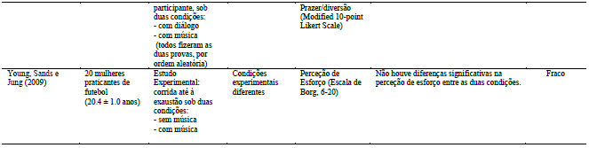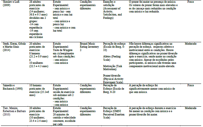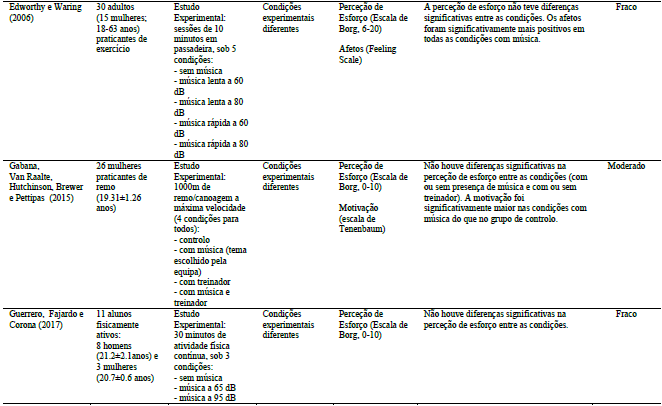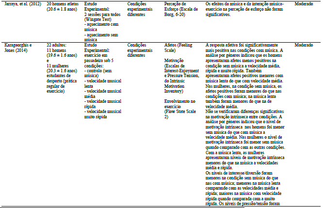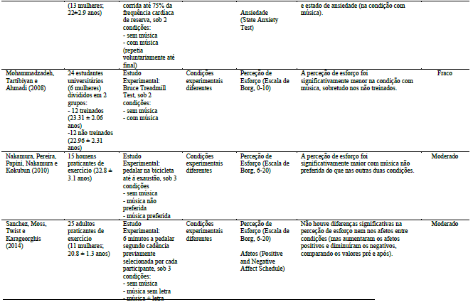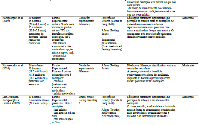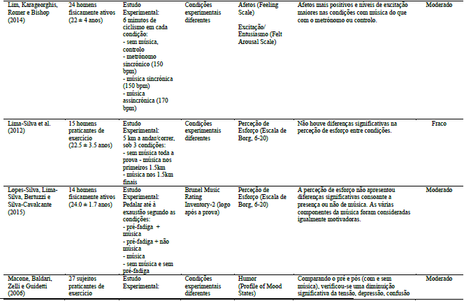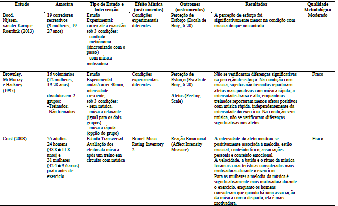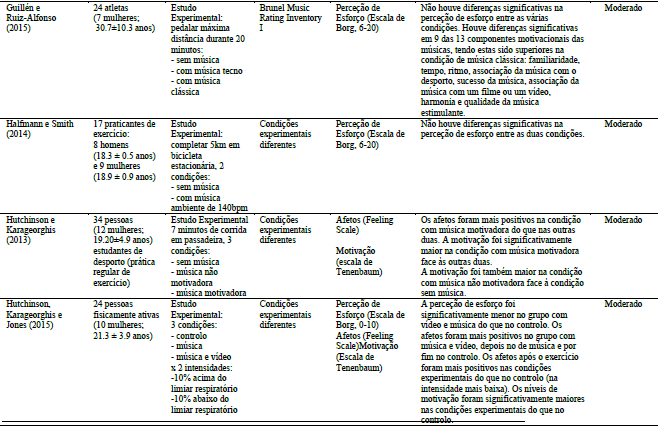 No que se refere à qualidade metodológica dos estudos, 18 foram classificados com qualidade moderada (Bood et al., 2013; Gabana et al., 2015; Guillén & Ruiz-Alfonso, 2015; Halfmann & Smith, 2014; Hutchinson & Karageorghis, 2013; Hutchinson, Karageorghis & Jones, 2015; Jarraya et al., 2012; Karageorghis & Jones, 2014; Karageorghis et al., 2009; Karageorghis et al., 2010; Lim et al., 2009; Lim et al., 2014; Lopes-Silva et al., 2015; Macone et al., 2006; Nakamura et al., 2010; Sanchez et al., 2014; Stork et al., 2014; Tiev et al., 2010) e 9 com qualidade fraca (Brownley, McMurray & Hackney, 1995; Crust, 2008; Edworthy & Waring, 2006; Guerrero, Fajardo & Corona, 2017; Lima-Silva et al. 2012; Mohammadzadeh, Tartibiyan & Ahmadi, 2008; Shaulov & Lufi, 2009; Szmedra & Bacharach, 1998; Young, Sands & Jung, 2009). Esta avaliação derivou do facto das amostras dos vários estudos serem compostas por voluntários ou formadas por conveniência, não sendo representativas da população em nenhum dos casos (sub-classificação de representatividade da amostra fraca), e ainda do facto de não ter sido assegurado que os responsáveis pelas avaliações feitas estivessem cegos no que respeita à condição dos participantes.