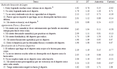 Los resultados de los estadísticos descriptivos de cada uno de los ítems que componen el Cuestionario de Burnout del Deportista (ABQ) se muestran en la Tabla 1. La media de los ítems oscila entre 1.66 (DT = 1.10) del ítem 15, y 2.67 (DT = 1.12) del ítem 2. La asimetría y la curtosis reflejan una distribución normal, encontrándose en los parámetros aceptados [-2, 2] (Muthé y Keplan 1985, 1992; Bandalos y Finney, 2010).