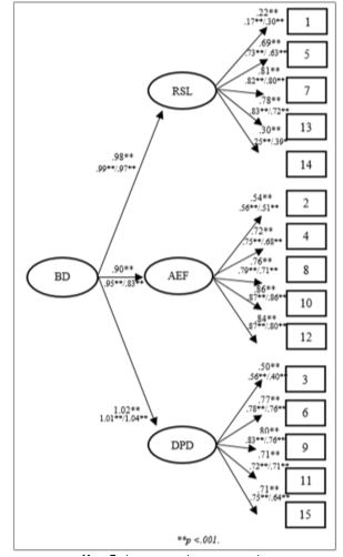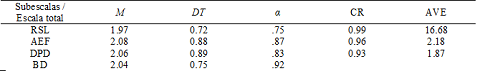 A continuación, se confirmaron los tres factores, mediante el promedio obtenido de los ítems que lo conforman. Los estadísticos descriptivos, la consistencia interna a través del coeficiente de Alfa de Cronbach, la fiabilidad compuesta (CR), y la varianza media extractada de la escala (AVE) de las subescalas, se pueden observar en la Tabla 2. El análisis de fiabilidad a través del coeficiente alfa de Cronbach mostró que las tres subescalas presentan una buena consistencia interna, demostrando que sus ítems miden un mismo constructo y están altamente correlacionados (George y Mallery, 2003). La escala general obtiene un α = .92, siendo la fiabilidad en las subescalas de α = .75 en RSL, α = .87 en AEF y α = .83 en BDP. Asimismo, los resultados de la fiabilidad compuesta (CR) de las subescalas son superiores a .70, en un rango de .93 y .99, lo cual prueba la consistencia interna de las subescalas (Hair, Black, Babin, y Anderson, 2009). Por su parte, los resultados de la varianza media extractada de las tres subescalas mostraron valores adecuados, en este caso superiores a .50 (Fornell y Larcker, 1981), en un rango entre 1.87 y 16.68.