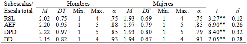 A continuación, se presentan los estadísticos descriptivos del instrumento y sus subescalas por género, la consistencia interna, y el análisis de diferencias a través de la prueba t de Student para muestras independientes (véase Tabla 3). Los resultados confirman la existencia de diferencias estadísticamente significativas entre los hombres y mujeres (p < .01) en todas las escalas, si bien los valores d para el tamaño del efecto muestran la pequeña magnitud de las diferencias.